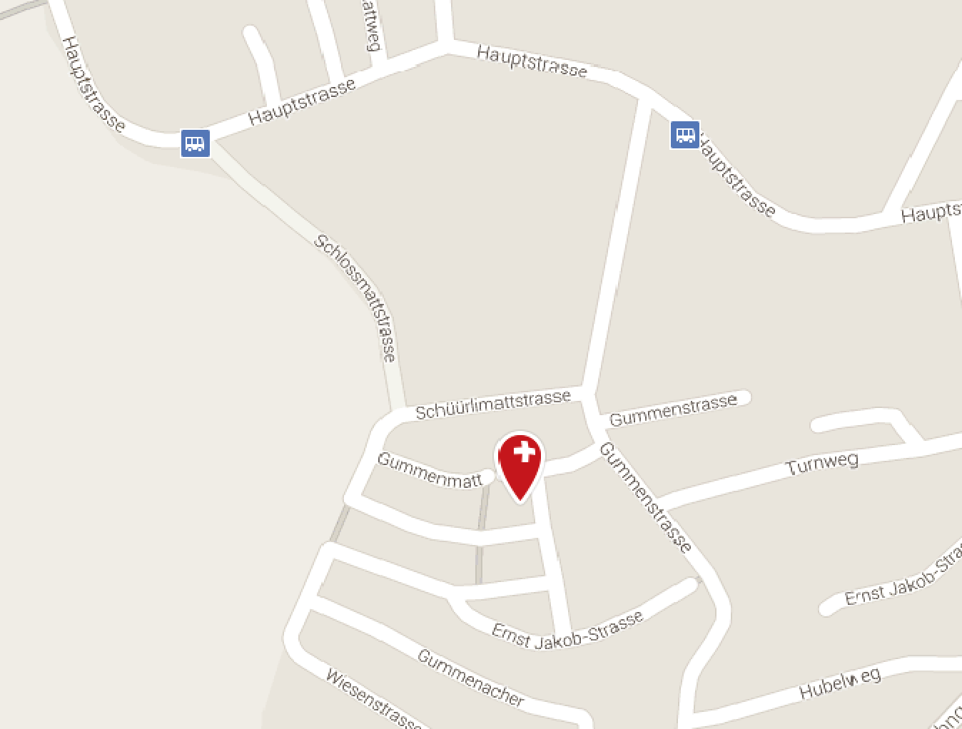 Haltestelle Gummen oder Schulweg, plus 5 Minuten zu Fuss.